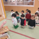 きく組(4歳児)が園舎の裏の畑に玉ねぎの苗を植えました。簡単そうだけど意外と難しい。「これがたまねぎになるん?」と不思議そうな顔…。早く植え終わった子は石を見つけて石遊びに熱中していました。1人7本ず ...