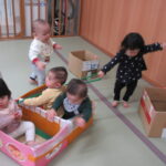 園内をお散歩していつもと違う教室に遊びに行きました。 いっぱい遊んで楽しかったね! 上手に歩いてうめ組の教室に帰りました。