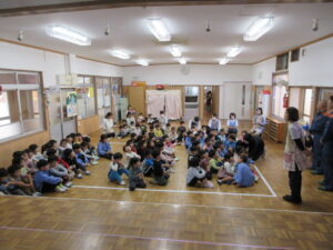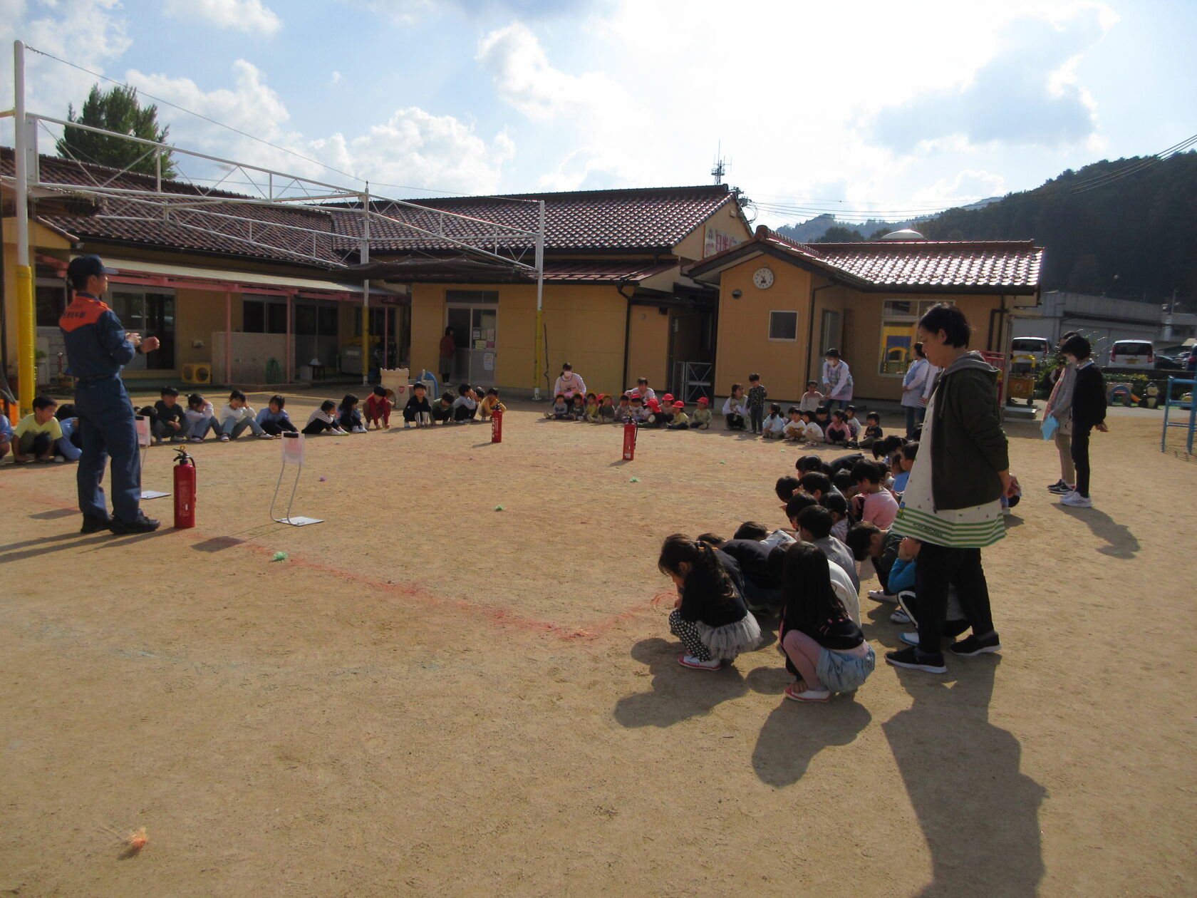 火災報知機のベルが鳴り、放送を聞いて園庭のお地蔵様の前に避難しました。