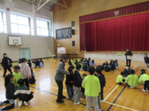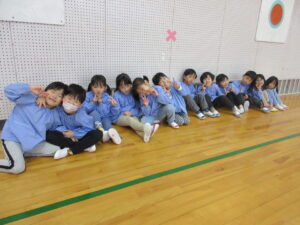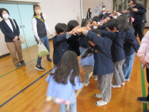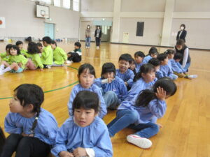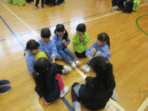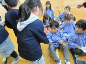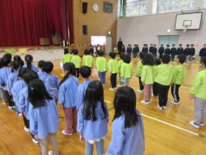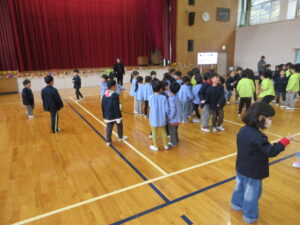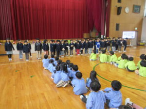 「八鹿小学校1年生と5歳児との交流会」があり、園の送迎バスに乗って八鹿小学校に行きました。