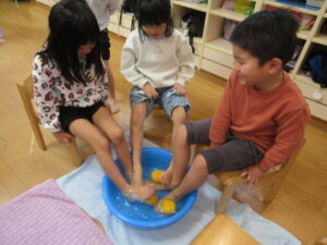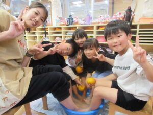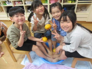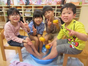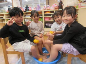 みんなで「きんかん」を食べて柚の足湯に入り、運を呼び込みました。