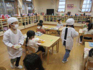 エプロンを着けて給食当番をしています。