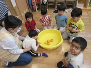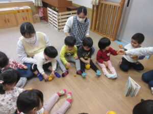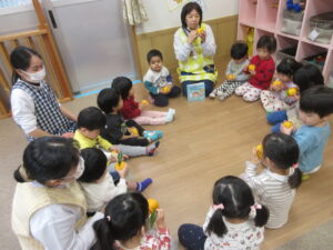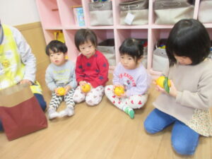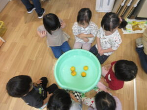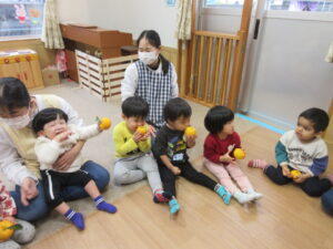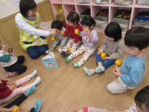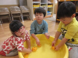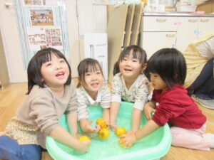 HOME > 園でのちょっとしたこと > 園でのちょっとしたこと もも組 投稿日:2025年12月22日 大好きな絵本「ぽかぽかゆずおふろ」 「柚ってみかんみたい」 「いいにおいがする!」 きんかんもみんなで触ってみました! 「きんかん、ちいさい!」 ぬるま湯に柚を浮かべてみました! 「柚のお風呂に入りた~い」 Twitter シェア Google+ Pocket B!はてブ LINE -園でのちょっとしたこと