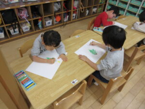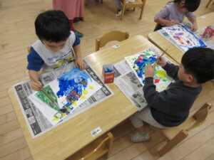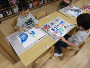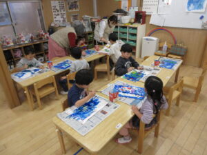 絵画教室で、クレパスと絵の具を使って「クリスマス」の絵を描きました。