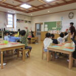 絵本の読み聞かせ。集中しています。 きく組さんが遊びに来てくれました。