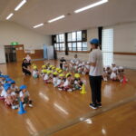 「ちえのみあそび」をしました。 最初は三角や四角を作り、その後は自分で考えた模様を作りました。 お遊戯室で竹馬をしました。 少しずつ上手になってきました。