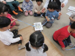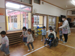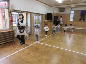 お遊戯室で礼拝をした後、ピアノの曲に合わせてマラソン遊びをしました。