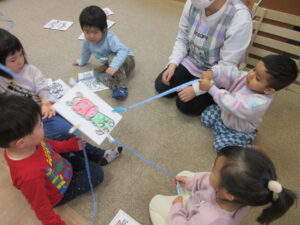 ぬり絵のカードで「福おとこ福おんなだーれ」のゲーム大会。