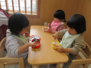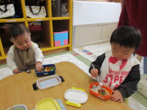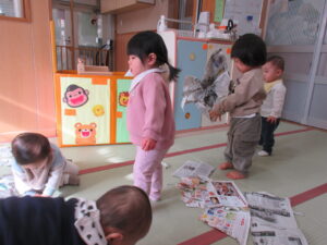 HOME > 園でのちょっとしたこと > 園でのちょっとしたこと さくら組 投稿日:2026年1月21日 ばら組さんのお餅つきの応援をしました。 室内では紙を破って遊びました。 お楽しみのお弁当🍱 上手に食べられるようになってきました。 Twitter シェア Google+ Pocket B!はてブ LINE -園でのちょっとしたこと