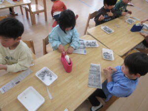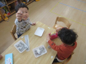 新聞紙で豆まき用の豆を作りました。