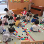 🐸カエルの体操🐸 こまをまわしてみましょう☺ 「じょうずにまわるかな!」 上履きを自分で履こうと頑張っています。 ボール遊び。 楽しく体を動かしました。