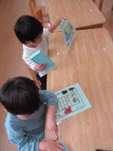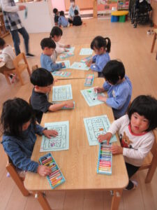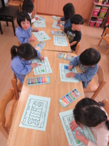 こいのぼりに色を塗りました。「何色で塗ろうかな!」
