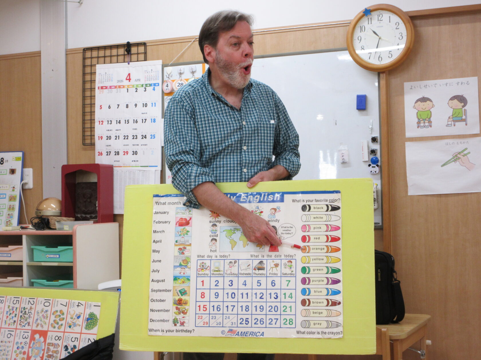 「black」「pink」「brown」と先生の英語を聞いて色探しをして遊びました。