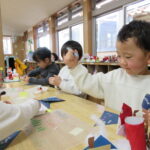 梅雨らしい天気になってきました。 今日は、きく組さんが泥んこあそびをしようと園庭に出たら雨が降り始め、ほとんど遊べませんでした。 ゆり・きく・ばら組の制作あそびの様子です。