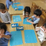 梅雨らしい天気になってきました。 今日は、きく組さんが泥んこあそびをしようと園庭に出たら雨が降り始め、ほとんど遊べませんでした。 ゆり・きく・ばら組の制作あそびの様子です。