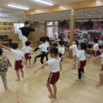 窓越しに、大きいクラスの運動会練習を見学しました。